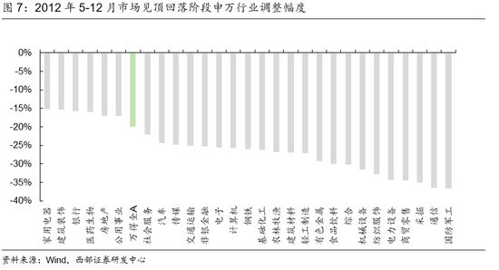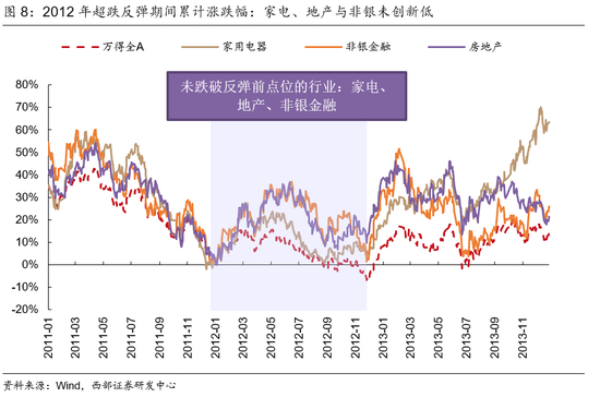综合来看,在2012年初反弹启动至12月再度见底的时期,房地产取得了13.59%的绝对收益,涨幅排名第一,建筑装饰、家用电器、医药与非银金融亦收涨。从行业的走势与点位来看,地产、家电与非银在此期间守住了反弹前的点位。