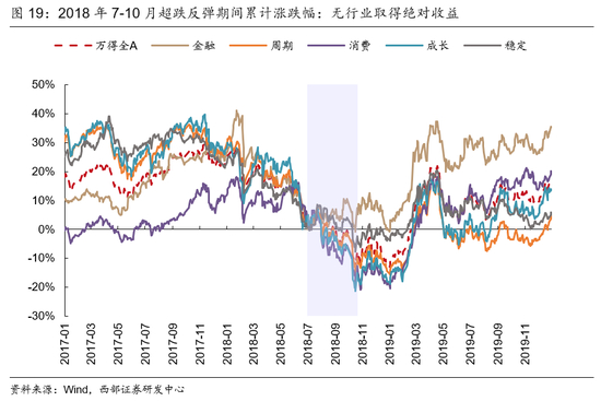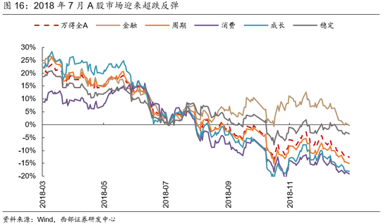 2018年7月,市场超跌与政策转向预期推动市场短期反弹,但预期落空叠加外部冲击导致市场走弱。受到中美贸易摩擦叠加去杠杆的冲击,2018年A股市场步入熊市。到了下半年,6月24日,央行定向降低存款准备金0.5%,但市场预期仍然偏弱,直到6月28日央行货币政策委员会2季度例会强调货币政策要“松紧适度”,流动性由“合理稳定”到“合理充裕”,引导货币信贷及社会融资规模合理增长,市场信心才逐步企稳。这一轮市场的阶段性底部出现在7月6日,彼时万得全A从1月份的高点已经跌了超过22%。在7月23日,央行往市场投放5020亿MLF,当晚国常会强调“稳健的货币政策要松紧适度”,政策宽松预期推动反弹。本轮反弹A股于2018年7月25日见顶,持续时间仅为14个交易日,万得全A累计反弹了7.08%。
