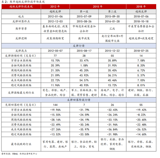 我们复盘了历史上2012年、2015年、2018年熊市中A股发生过超跌反弹的四个阶段。我们从几个维度来看看历史上的熊市反弹行情: