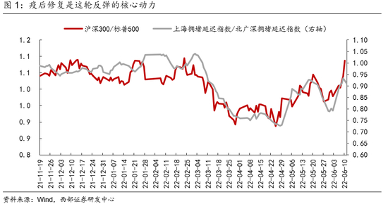 市场对于疫后修复预期已经接近均衡水平。随着近期聚集性疫情事件反复,疫后经济修复的节奏有所趋缓,6月11日上海的交通拥堵指数均较前一日出现大幅回落,且相对其他一线城市修复节奏趋缓。而从市场层面看,近期A股相对强势的市场表现已经较为充分的预期了上海经济完全恢复正常水平,未来一段时间市场预期围绕经济修复节奏反复修正的概率正在上升。