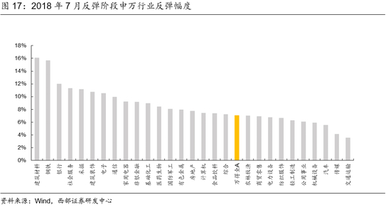风险释放后建材、钢铁、银行表现领先。2018年7月的超跌反弹期间,金融、稳定风格相对占优,其中金融风格累计上涨10.58%。行业层面来看,市场情绪依然处于悲观当中,去杠杆利空有所缓和的同时货币政策宽松得到确认,前期受到经济下行与信用端紧缩压力的金融与部分周期行业反弹力度更大,叠加建材与钢铁业绩预报较好,建筑材料与钢铁行业最大涨幅达到了16.08%与15.70%,其次是银行,反弹幅度达到11.99%。