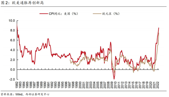 5月欧美通胀再超预期。美国5月份的CPI数据再度超预期,同比上涨8.6%,创出1981年12月以来的四十年新高,CPI环比增长1%。当月所有通胀类别均出现上涨,尤以住房、汽油和食品价格为甚。5月汽油价格指数由跌转涨,环比上涨4.1%;食品价格环比上涨1.2%。5月31日,欧盟统计局公布了初步估计的欧元区5月通胀数据。欧元区本月消费者价格指数同比上涨8.1%,继4月该指数同比上涨7.4%之后再次刷新欧元区成立以来的历史纪录,也超出了此前市场预期的7.7%。
