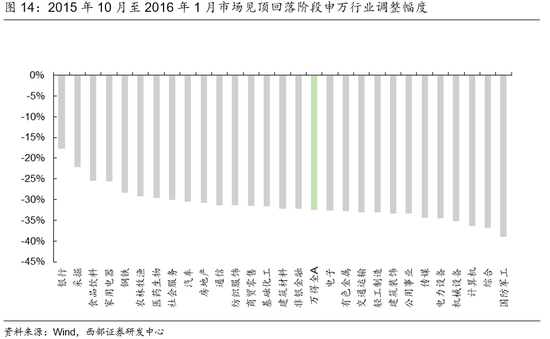 随着注册制改革预期不断发酵,美联储加息,国内政策密集落地以及年末供给侧改革得到进一步强调,市场步入震荡。而在2016年初A股市场出现异常波动,这一轮调整持续到了1月末,持续时间达到了26个交易日,万得全A累计下跌32.43%。