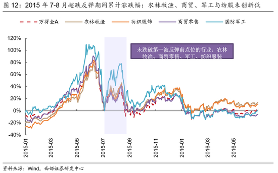 综合来看,在2015年7-8月反弹启动回落时期,军工与必须消费(农林牧渔、商贸零售与纺织服装)取得了绝对收益并守住了反弹前的点位,其中军工累计上涨了13.24%,农林牧渔上涨了5.26%。