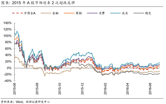 2015年A股大起大落,两次反弹但在因为非市场因素冲击戛然而止。2015年6月12日,监管层清理场内外配资引发市场恐慌,A股大幅杀跌。多轮救市政策相继出台,7月4日证监会决定暂缓IPO发行,7 月 8 日央行发言人表示继续通过多渠道提供流动性,“国家队”资金也参与救市,A股市场企稳回升。2015年的第一轮反弹并不一帆风顺,市场在7-8月走出了倒“W”型走势,A股于8月17日见顶,本轮反弹持续时间达28个交易日,万得全A累计反弹了33.47%。
