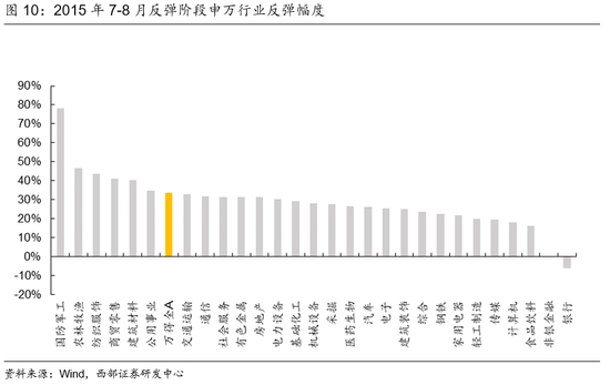 在市场风险偏好修复过程中,成长风格反弹力度更大,军工行业领涨市场。本轮市场的反弹主要逻辑在于救市政策出台后的风险偏好回升,因此经历了前期杀跌后的成长风格迎来更为强劲的估值修复行情,累计涨幅近55%,除了金融收益仅为1.9%以外其余风格涨幅在40%以上。行业层面来看,前期超跌的国防军工遥遥领先,最大反弹涨幅达到了78.06%,主要是由于前期跌幅较大,以及受抗战胜利70周年大阅兵事件与军民融合政策催化有关;其次是受益于2015年猪周期向上,畜禽养殖基本面确定性强的农林牧渔,涨幅居后达46.47%;纺织服饰与商贸零售最大涨幅分别达到了43.46%与41.08%。