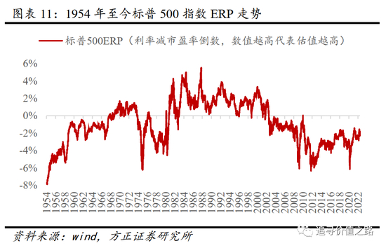 图表11报告了我们计算的标普500指数ERP(股权风险溢价)走势情况,这里的计算公式为无风险利率减去市盈率倒数,即数值越高代表权益资产估值越高,数值越低代表股市估值越低。以此计算,目前美股的ERP水平在1954年以来的32.5%分位数,2000年以来的54.3%分位数,2010年以来的89%分位数。综合图表9和图表11的结果,大体可以认为,目前美股估值在历史平均水平位置。