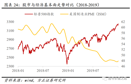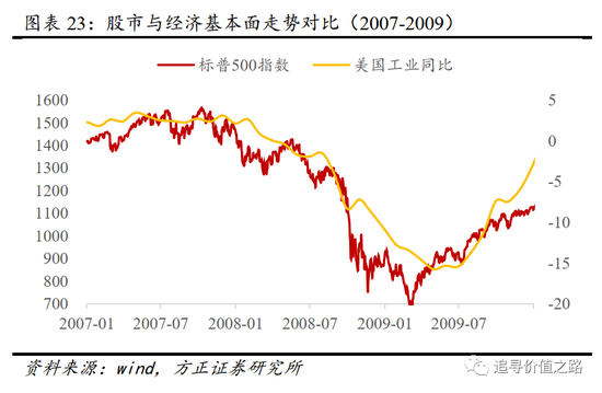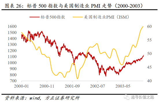 从图表25和图表26中可以看出,无论是美国工业生产同比增速还是ISM制造业PMI指数,都反映出经济的低点大致在2001年底左右出现,而那次美股要到2002年10月才真正见底,股市低点滞后基本面很长时间。
