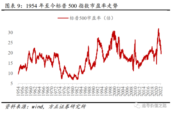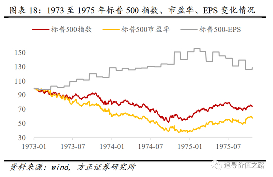 从过去几次美股大跌的历史经验来看,往往在股价大跌期间,EPS变化不大甚至还是上升的,等EPS真正进入下行阶段,股价已经见底回升(比如图表18中1973到174年大跌时的情况)。