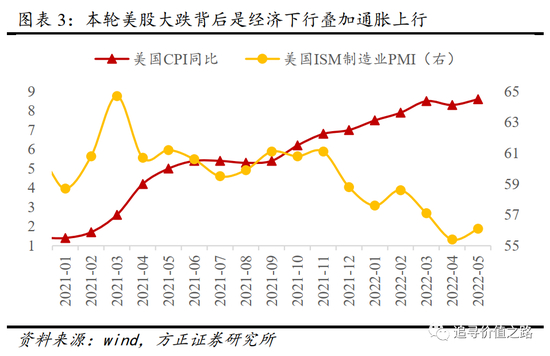 造成本轮美股大跌的原因非常清晰,即出现了非常不利的宏观场景组合:通货膨胀大幅上行与经济增长持续下行(参见图表3)。