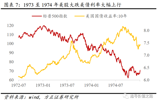 为了遏制通货膨胀上行,美联储从1973年年初开始持续加息,并且是连续加息,到1973年8月,美联储1973年年内已经加息7次。在此背景下,从1973年年初开始,美国国债利率持续上行,而股市大幅下跌。标普500指数1973年全年累计下跌17.4%。