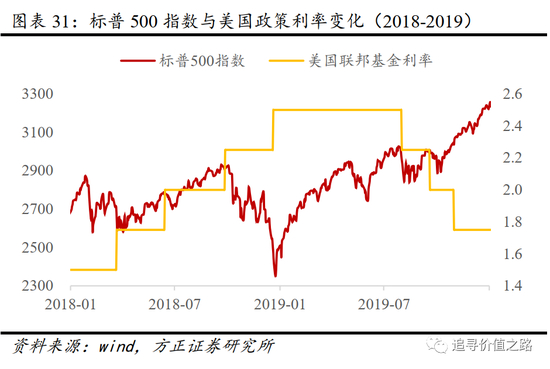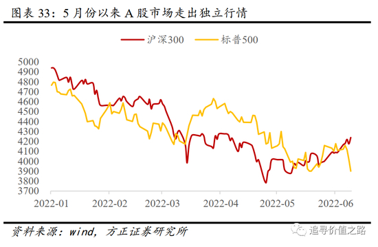但短期悲观情绪传染更多的是一种“黑天鹅”式的事件性扰动,不会有长远影响。而且从近期中美两国股市走势来看,A股已经完全走出了独立行情(参见图表33),美股多次大跌都没有影响到次日A股的行情。