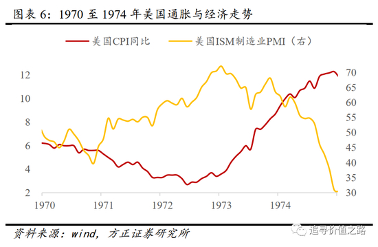但行政手段并没有一劳永逸地解决通胀问题,PPI和CPI同比在1972年四季度开始再度明显回升,与此同时美国经济在1973年年初开始见顶回落,各项经济增长指标均开始显著下行。因此,从1973年年初开始美国经济进入到了一个“经济下行、通胀上行”的阶段(参见图表6),与2022年当前的经济形势非常类似(参见图表3)。