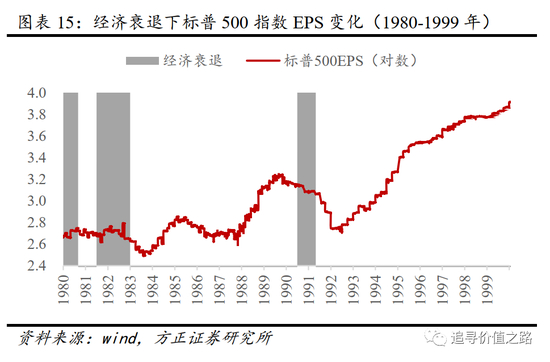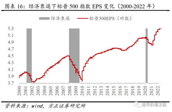 图表14、图表15、图表16报告了标普500指数EPS的长期走势,其中用灰色阴影部分将经济衰退期间进行标注(美国经济衰退阶段划分使用NBER定义)。