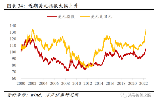 随着近期欧美经济体加快货币政策收紧步伐,其对其他经济体的外溢效应逐步显现。一方面,我们看到美元指数近期不断上升,引发其他国家汇率有贬值压力,其中日元兑美元汇率近期大幅贬值,跌至20年来新低(参见图表34)。