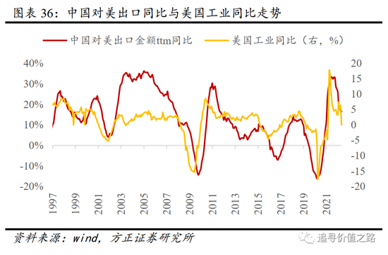 从中国对美国出口金额与美国工业生产同比增速的走势中,也可以看到两者相关系数非常高(参见图表36)。因此当前情况下,如果美股大跌最后引发美国经济衰退,预计仍将对中国经济和资本市场产生较大的负面冲击。