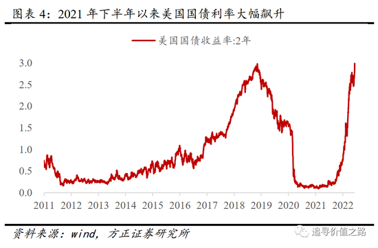 在美联储持续加息预期升温作用下,美国国债利率不断攀升,而且上行斜率极其陡峭(参见图表4),截止2022年6月10日,美国2年期国债到期收益率已经升至3.06%、10年期国债到期收益率升至3.15%。