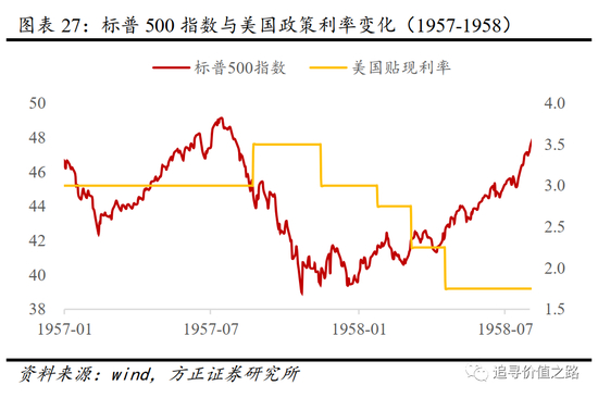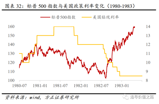 从图表8中总结的几次发生在“经济下行+加息周期”大跌来看,股市下跌的低点绝大多数时间都出现在“末次加息之后、首次降息之前”这个时间窗口中,这个规律非常显著,比如1957年大跌(参见图表27)、1966年大跌(参见图表28)、1970年大跌(参见图表29)、1974年大跌(参见图表30)、2018年大跌(参见图表31)。一个例外是1982年大跌,股市低点出现得更晚,是在后续多次降息后才出现(参见图表32)。但无论如何,目前来看,历史上的美股大跌低点还没有在加息周期中出现过。