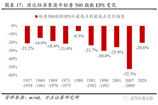 图表17统计了1957年至2020年一共10次经济衰退期间,标普500指数EPS从最高点到最低点的下降幅度,10次经济衰退中标普500指数EPS平均回落幅度是23.5%。值得指出的是,这里统计的是经济衰退前后,EPS从最高点到最低点的回落幅度,从统计时间范围上来看,要大于图表14、图表15、图表16中灰色标出的经济衰退阶段。