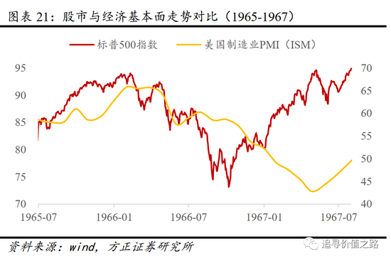 过去这么多次美股大跌中,比如1957年大跌(参见图表20)、1966年(参见图表21)、1973年到1974年大跌(参见图表22)、2007年到2009年大跌(参见图表23)、2018年大跌(参见图表24),基本上都是这样的走势。这其中2009年那次大跌,从数据上看,股市的低点领先于美国工业生产同比增速低点,但是滞后于ISM制造业PMI指数低点,这是技术层面的度量问题,不影响基本逻辑的成立。