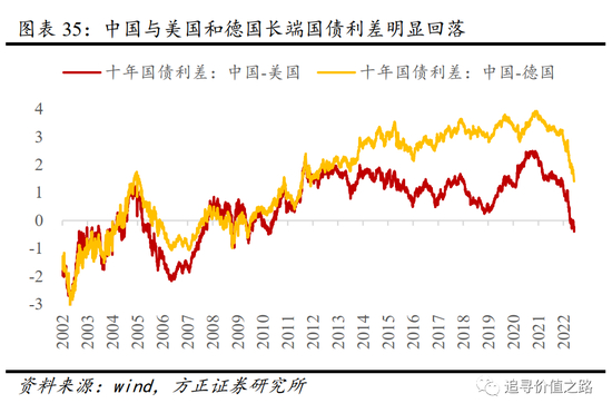 另一方面,目前中国和美国以及欧洲国家的国债利差大幅下降(参见图表35),中美长端国债利差已经倒挂(中国10年期国债利率低于美国)。这种情况下,未来国内货币政策预计会继续保持以我为主的主基调,但是短期国内利率进一步下行的空间也势必会受到影响。