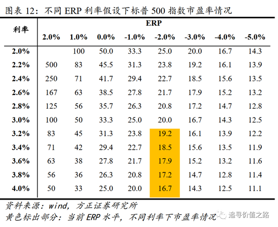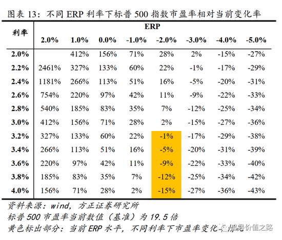 在给定当前ERP水平不变的情况下,如果未来无风险利率上行至3.5%(现在3.15%),则对应标普500市盈率将下降6%左右。图表12和图表13汇报了在不同ERP和利率水平下,标普500指数市盈率的不同变化,以及对应当前市盈率(19.5倍)的变化率情况。据此推算,如果按照相对悲观的预期,后续10年期美国国债到期收益率会上升到4.0%,那么标普500指数市盈率还有约15%的下跌空间。