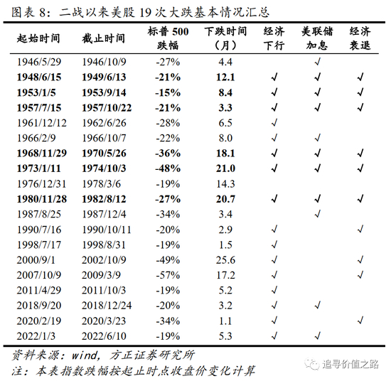 根据我们的统计,战后至今美股标普500指数单次跌幅超过15%的共有19次,其中“经济下行+美联储加息+经济衰退”组合一共发生过6次,平均下跌时间是13.9个月,标普500指数平均跌幅为28%。