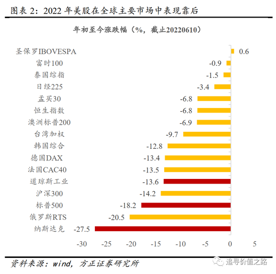 截至2022年6月10日收盘,美股三大指数道琼斯工业指数、标普500指数、纳斯达克指数,全年累计跌幅分别为13.6%、18.2%、27.5%,在全球主要股市中表现明显靠后(参见图表2)。