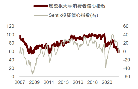外需增长放缓亦将缓解我国的通胀压力。由于联储较快收紧金融条件、以抑制经济过热、从而对抗通胀,我们认为美国经济增速或将放缓,密歇根大学消费信心指数和Sentix投资信心指数今年以来均加速下行。欧元区和英国在俄乌冲突中通胀受影响更大,紧缩亦更坚决,而经济复苏原本就疲软,未来衰退风险更大。此外,随着海外开放加快、生产恢复,部分低附加值的外需已加快回流至东南亚,未来我国高企的出口份额可能亦会下降。