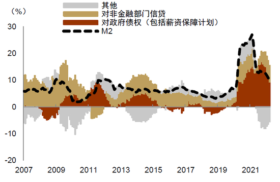 一是由于宏观政策不同。应对疫情,美国是财政投放基础货币,改善私人资产负债表,需求更强,通胀压力更大,胀大于滞;中国是信贷投放派生货币,私人资产负债表并未改善,2021年为了抑制信贷带来的资产泡沫和债务风险,金融周期重回下行,地产企业去杠杆,居民和中小企业加杠杆空间缩小,需求弱,通胀弱,滞大于胀。