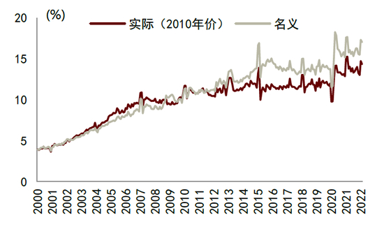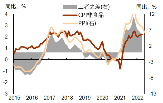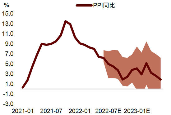 PPI方面,大宗价格或高位震荡,高基数拖累下行。对俄制裁加大国际原油供应和涨价风险。煤炭紧平衡下价格有阶段性上行压力,但国内保供稳价措施限制涨幅;随着本轮电改接近尾声,电价涨势或放缓;黑色金属受稳增长政策发力影响,需求或有支撑,但成本回落缓解涨价压力。尽管部分工业品价格仍偏强,但受高基数影响,PPI整体处下行通道。我们预计22Q3-23Q2四个季度PPI同比分别为4.4%、2.7%、4.1%、2.6%,今年全年在5.5%左右。