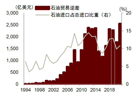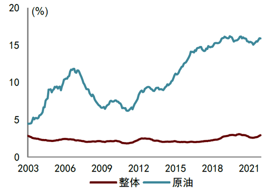 能源方面,纵向对比看,我国石油进口依赖度在上升,大宗价格上涨对我国通胀的影响在加大。过去20年我国石油进口依赖度上升,我国石油消费量在全球占比达到17.8%,仅次于美国和欧盟,2000-2020年年均增速达5.7%;2021年我国已超过欧盟,成为全球第二大石油进口国,石油进口占我国总进口比重从2000年的6.6%提升至11.5%。但横向对比看,我国对石油的依赖度和贸易逆差低于很多其他新兴经济体,且国内成品油与国际油价仍有一定的防火墙(成品油价格机制设定调控上、下限分别为130美元/桶和40美元/桶)。2021年我国能源消费中石油占比不足20%,煤炭占比则达57%,石油消耗密度(石油消费/GDP)为45吨/百万美元,石油贸易逆差占GDP仅1.2%,低于大多新兴经济体,且政府对国内油价的调控仍强,与国际油价仍有一定的防火墙(成品油价格机制设定调控上、下限分别为130美元/桶和40美元/桶)。根据我们的测算,油价同比涨幅每扩大10个百分点,对我国未来12个月PPI和CPI平均同比拉抬0.4-0.7和0.1-0.2个百分点。