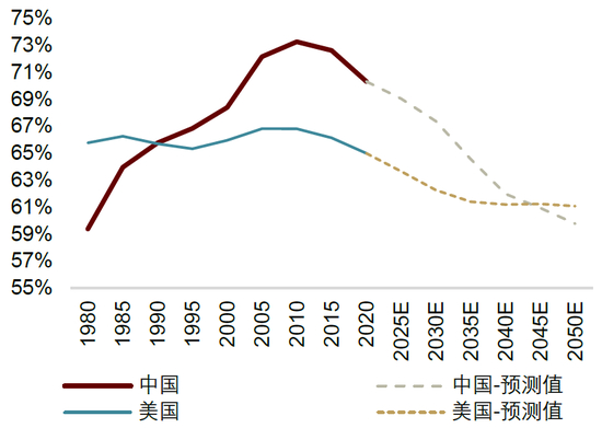 资料来源:United Nations, Department of Economic and Social Affairs, Population Division (2019),中金公司研究部;注:劳动年龄人口占比为15-64岁人口占总人口比例