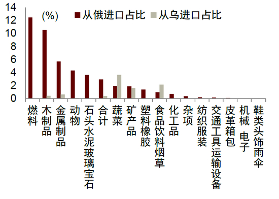 中国从俄进口原材料的比重比较高,燃料、木制品、金属制品占比分别为12.5%、10.5%、5.7%,其中2021年从俄罗斯进口原油的比重为16%。但由于中国并未对俄实行能源进口禁令,且成品油调价机制有缓冲带,我国油气价格涨幅小于国际价格。而且由于我国主要粮食的进口依存度较低、且库存远高于国际平均,从年初中央一号文即重申“坚持中国人的饭碗任何时候都要牢牢端在自己手中,饭碗主要装中国粮”,目前正多措并举抓好春耕备耕,力保夏粮丰收,国际粮价影响或可控,俄乌冲突以来,我国国内小麦、稻谷、玉米价格涨幅远小于国际粮价,CPI粮价同比从2月的1.5%上升到5月的3.2%,过去3个月对CPI同比的边际抬升只有0.05ppt。
