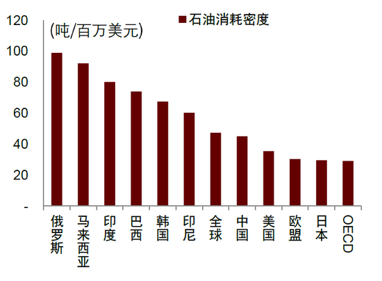 资料来源:万得资讯,中金公司研究部注:能耗密度指石油消费对GDP之比。