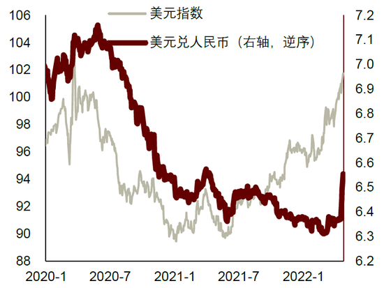 4月20日以来,人民币贬值压力大幅释放,一度贬值5.2%。从内部看,我们认为,疫情冲击可能削弱经常账户顺差、中美利差转负将加大资本账户流出压力,增添贬值压力。从外部看,4月以来美联储超鹰表态、俄乌冲突加剧欧洲衰退风险、日本央行坚持超宽松的货币政策,带动美元快速升值,加大人民币贬值压力。