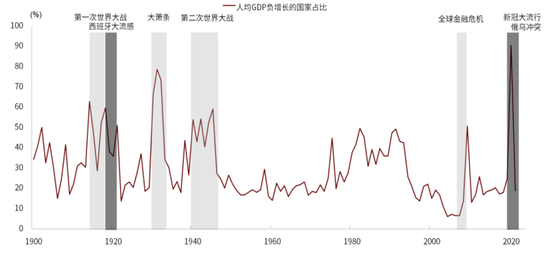新冠疫情和俄乌冲突都对全球经济带来供给冲击和滞胀压力,而上一次出现双重冲击还是在1914-1918一战、1918-1920西班牙大流感时期。(图表1)