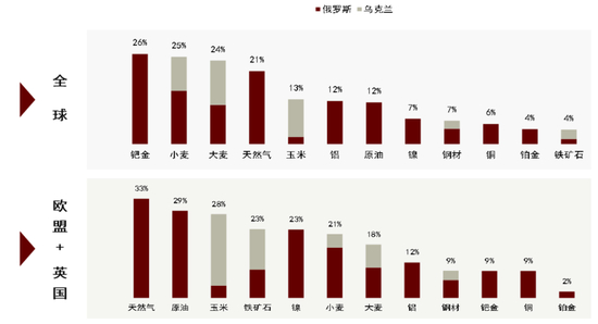 图表29:俄罗斯、乌克兰两国主要大宗商品出口在全球和欧洲市场中的占比情况(2021年)
