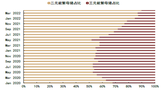 猪周期拐点已至,三季度猪价或反转,但反弹高度或难强。从供给看,能繁母猪去化已接近尾声,存栏较去年6月份高点下降了9%以上;出栏基数看,今年三季度出栏量可能开始下降,支持猪价在三季度反转。但产能结构继续优化、二元猪占比持续提升(图表55),母猪配种分娩率等生产指标优化。同时,疫情反复压制收入和需求或限制反弹高度。我们的测算表明,除了供给端因素(能繁母猪存栏和仔猪价格、饲料价格如玉米大豆、替代品价格如鸡蛋)对猪肉价格有显著影响外,需求侧因素如消费、货币增速同样会影响猪肉价格。据中金大宗组预测,今年2-4季度,生猪价格或从14.5元/公斤逐季上升至19. 5元/公斤。