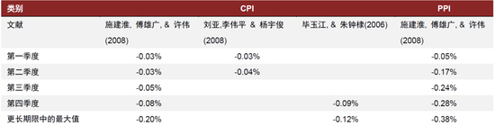 实证结果表明汇率与CPI和PPI之间存在负向关系,表明间接效应或为主导。汇率对PPI的影响较强,对CPI的影响较弱,主要由于消费品中包含了很多非贸易品,而我国的进口品中大宗和原材料占比较高,其传导到终端消费价格仍需视终端需求而定,一般情况下,原材料对终端产品的实际传导都远小于完全传导。实证研究显示,人民币名义有效汇率贬值1%,对未来12个月PPI平均提升0.2ppt,对CPI同比平均提升0.05ppt。
