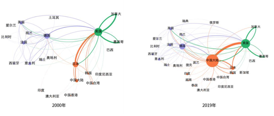 注:产成品指的是被直接进口国吸收的最终商品出口。根据全球价值链的分析框架,一国总出口可以分解为产成品出口、中间产品出口等部分。贸易流向图中体现了超过50亿美元(以2000年美元不变价记)的双边贸易,任意一条曲线代表按顺时针方向的上游节点出口商品至下游节点。节点大小代表经济体的总出口金额,曲线粗细代表双边贸易量的大小。节点颜色中,紫色代表欧洲地区,橙色代表亚洲和澳洲地区,绿色代表美洲地区;曲线颜色与出口国颜色相同。