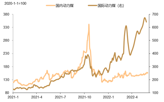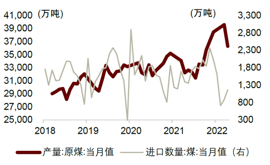 进口煤价居高难下,国内保供压力仍存(图表46-47),取决于国内产能供给,局部地区和时段或有煤价上行压力。国际煤价方面,需求仍强,供给弹性较低,支撑价格高位波动。短期来看,中金大宗组认为,8月俄煤禁运前欧洲将加速进口补库,气价高企之下的气煤转换提供增量需求,印度高温用电短期需求旺盛。而供给侧看,俄煤禁令生效后,欧洲或将转向澳大利亚、美国等进口地,但近几年煤炭行业固定资产投资疲弱,供给弹性较低。国内煤价需求修复和保供并行,紧平衡下局地和旺季或仍有煤价上行压力。需求侧看,下半年疫情缓解和基建转化为实物工作量后,用煤需求修复,但或受制于地产疲弱和海外需求放缓。供给侧看,自去年四季度以来煤炭增产增供持续加码,内部保供政策包括要求提升长协覆盖度与执行率,发改委要求煤炭企业的覆盖度不低于80%,年内再释放 3 亿吨的有效产能,今年以来原煤产量维持高位(图表48);进口利好因素包括蒙煤因疫情缓解或释放,煤炭进口税率暂降至零。