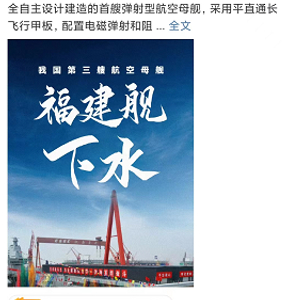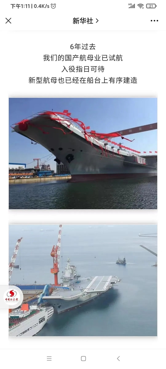 其实,早在2018年11月26日,新华社官方微信公众号一篇文章透露了中国第三艘航母的研制状况。在《6年前这个红遍全国“style”,至今让人心潮澎湃!》一文中指出,6年前11月23日中国首艘航母“辽宁舰”成功起降歼-15舰载机,6年过去,我们的国产航母业已试航,入役指日可待,新型航母也已经在船台上有序建造。新型航母也就是第三艘航母,这是官媒首次确认中国正在建造第三艘航母。