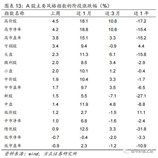 上周A股主要风格指数基本上涨,高估值风格表现显著强于中估值风格和低估值风格,新股风格表现中等。具体来看,上周高市净率风格指数涨幅领先,单周上涨4.2%。中市净率和低市净率风格指数表现次之,分别上涨1.0%、-0.7%,市盈率风格表现类似,高市盈率风格指数涨幅领先,单周上涨3.8%。中市盈率和低市盈率风格指数表现次之,分别上涨1.7%、-0.9%。上周中盘股涨幅弱于大盘股和小盘股,中盘、大盘、小盘风格指数分别上涨1.4%、2.3%和2.0%。亏损股表现好于微利股及绩优股,三类风格指数单周分别上涨3.4%、2.0%和0.9%。新股单周小幅上涨1.5%。