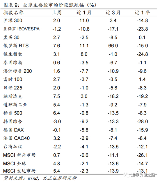 从全球权益市场来看,上周海外发达市场多数上涨,新兴市场部分进入调整期,俄罗斯RTS和纳斯达克指数大幅上涨。具体来看,发达市场中美股标普500指数、道琼斯工业指数和纳斯达克指数全线上涨,单周涨幅分别为6.4%、5.4%和7.5%。欧洲市场中法国CAC40指数上涨3.2%,富时100指数上涨2.7%,德国DAX指数微跌0.1%。日经225指数单周小幅上涨2.0%、俄罗斯RTS单周大涨7.6%,恒生指数上周上涨3.1%,澳洲标普200指数上涨1.6%,韩国综合指数上周领跌,跌幅为3.0%,新兴市场中孟买30指数单周上涨2.7%,圣保罗IBOVESPA指数单周下跌1.2%,台湾加权指数单周下跌2.2%。