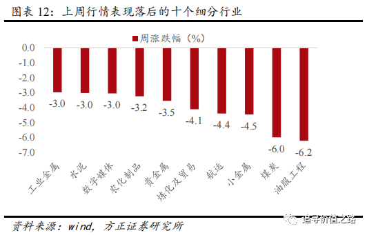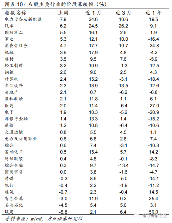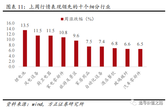 从我们筛选的108个细分行业来看,上周行情表现领先的前5名细分行业及周涨跌幅分别是锂电池(+13.5%)、风电设备(+11.5%)、厨卫电器(+11.5%)、家电零部件(+10.8%)、旅游及景区(+9.6%),上周汽车、新能源相关板块上涨较多。上周行情表现落后的后5名细分行业及周涨跌幅分别是油服工程(-6.2%)、煤炭(-6.0%)、小金属(-4.5%)、航运(-4.4%)、炼化及贸易(-4.1%),原因可能是上周大宗商品价格下跌带动。