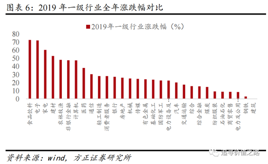 2019年各项经济指标再度开始下行,宏观经济重归平淡,但市场对于经济下行已经不再敏感。下半年由于美联储的“预防性降息”,全球流动性极度宽松,带动全球各类资产价格普涨,作为全球资本市场的一环,全球低利率环境使得外资不断流入A股市场,消费与科技的双轮驱动成为2019年最大的行情特征。一方面消费白马龙头受益于外资流入,另一方面中美贸易摩擦推动科技自主创新。从行业表现看,2019年食品饮料、电子、家电等行业涨幅领先。