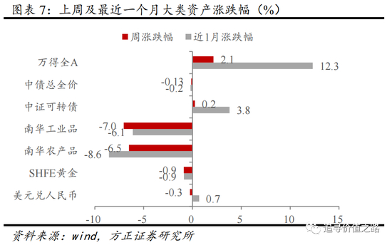 上周股票市场上涨,商品市场暴跌,债市小幅波动。具体来看,股票市场中,wind全A指数收涨,单周涨幅为2.1%。债券市场中,中债总全价指数小幅下跌0.13%,中证可转债指数单周上涨0.2%。商品市场中南华工业品指数和农产品指数暴跌,其中南华工业品下跌7.0%,南华农产品下跌6.5%,黄金价格出现下跌,单周跌幅为0.9%,上周人民币兑美元汇率略微升值,单周上涨0.3%。