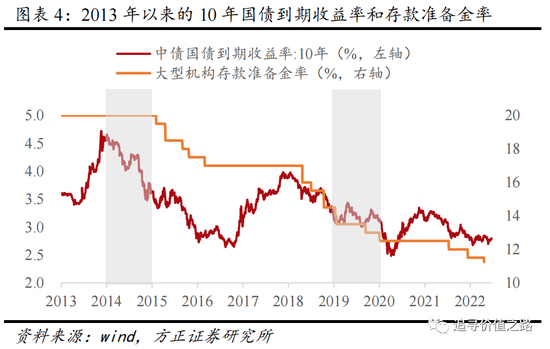 为稳住宏观经济增长目标,货币政策通常在此期间是较为宽松的。2014年中债10年国债到期收益率从年初的4.60%大幅降至年底的3.62%,2019年国内大型存款类金融机构人民币存款准备金率从年初的14.5%大幅降至年底的13%。
