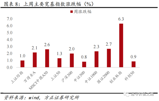 从主要宽基指数来看,上周主要指数普遍上涨。具体来看,创业板指数涨幅最大,周涨幅达到6.3%,其次是周涨幅为2.7%的国证2000指数,MSCI中国A50涨幅紧随其后,周涨幅为2.6%。上周,中证1000指数涨幅为2.3%,万得全A指数涨幅为2.1%,其余指数涨幅均在1%左右,如上证综指涨幅1.0%,上证50指数涨幅为1.3%,中证500指数涨幅为0.8%,科创50指数涨幅为0.9%。